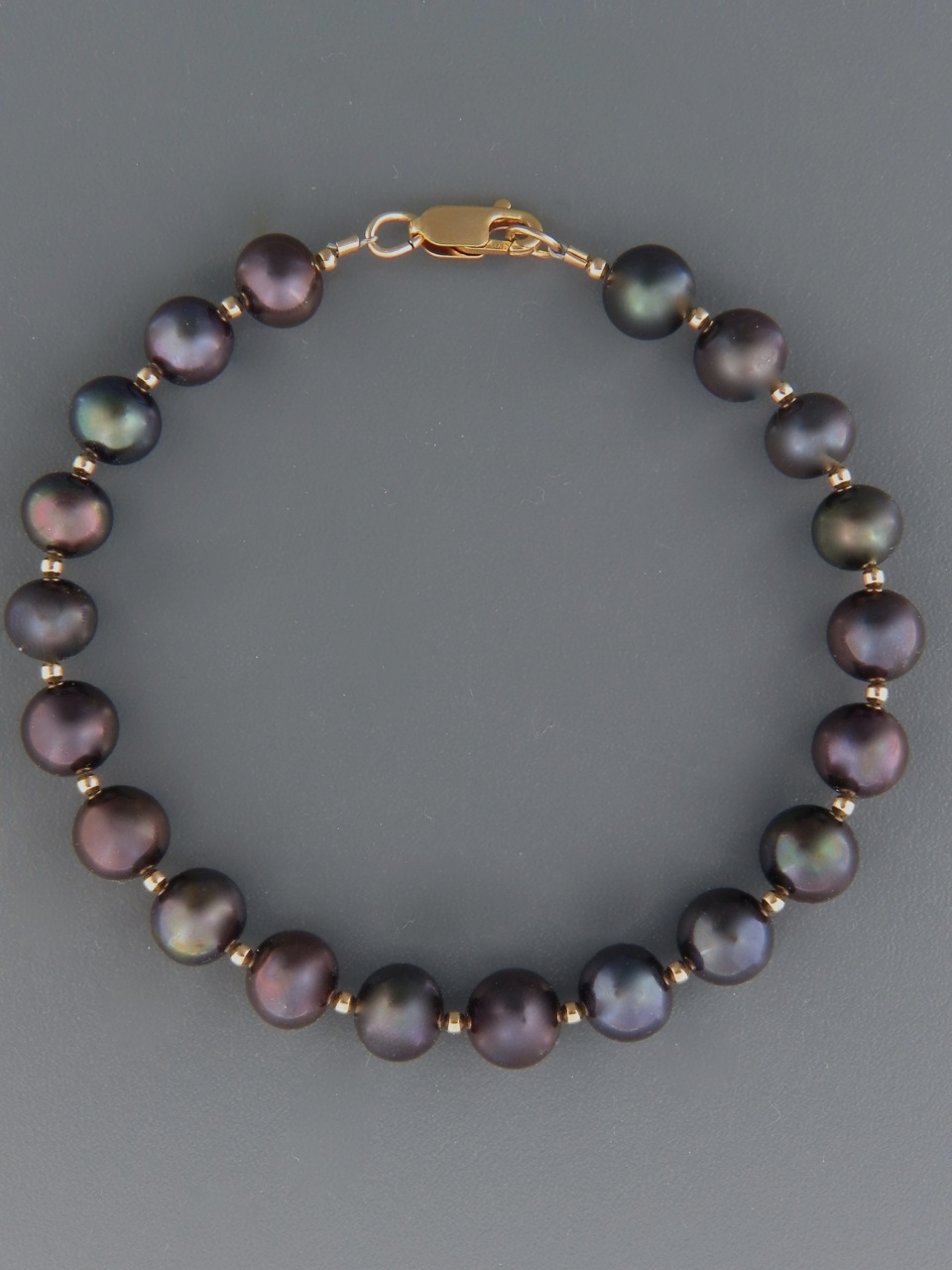 A bracelet featuring dark Freshwater Mussel Pearls with 2mm round gold beads.