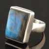 This Sterling Silver ring features a rectangular shaped raw, uncut Labradorite stone showing green/gold colours.